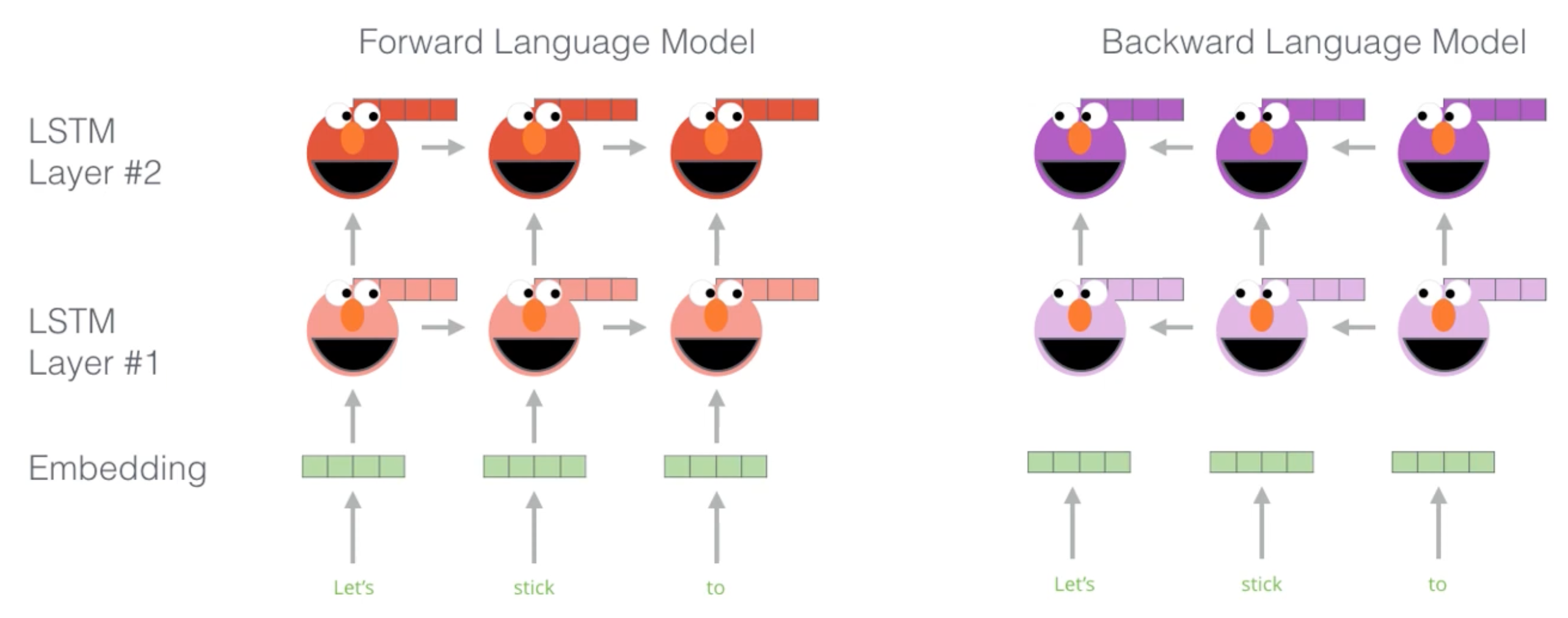 2. 이렇게 Forward 모델과 Backward 모델이 학습이 잘되고 나면, 나중에 우리가 사용하게 될 ELMo의 벡터는 위치(시점)가 같은 Forward layer와 Backword layer를 선택(여기서는 stick에 대한 입력, layer1, 2)한 다음