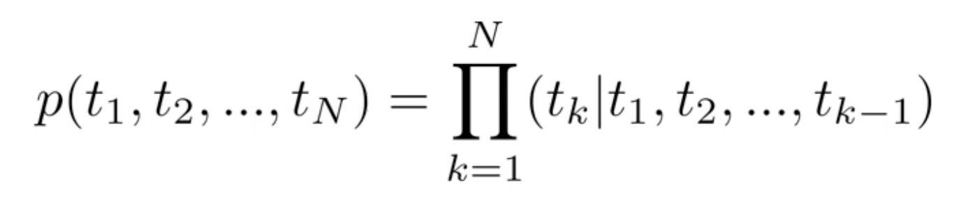 우리가 N개의 토큰이 주어져 있는 Sequence가 있다고 생각할 때, k번째 토큰을 예측하기 위해 1부터 k-1까지의 토큰을 가지고 있다고 가정하면 각각의 n개의 토큰 sequence가 나타날 확률은 아래와 같다.