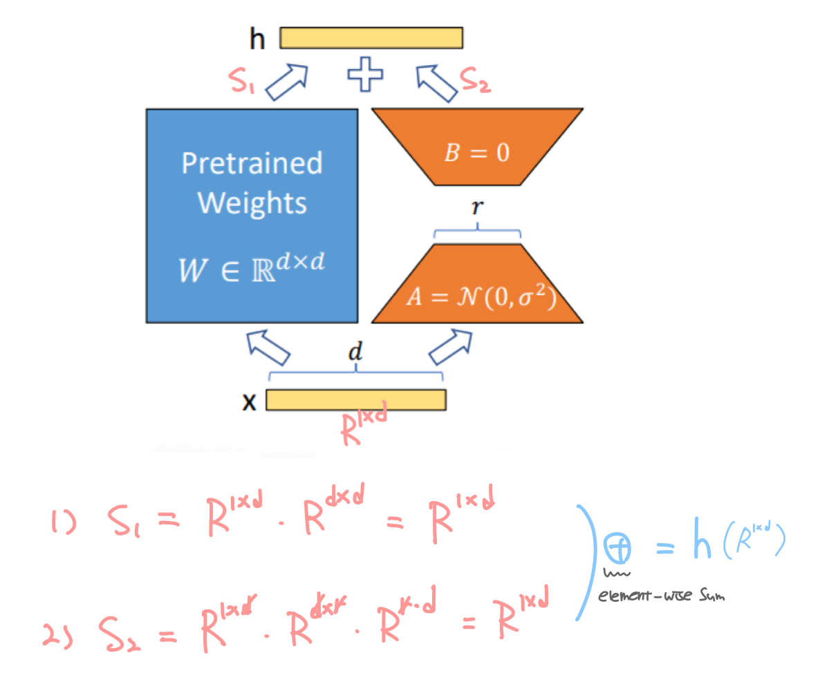 - $A, B$ (orange color): LoRA Adaptor (Fine tuning 학습되는 파라미터, LoRA의 핵심)